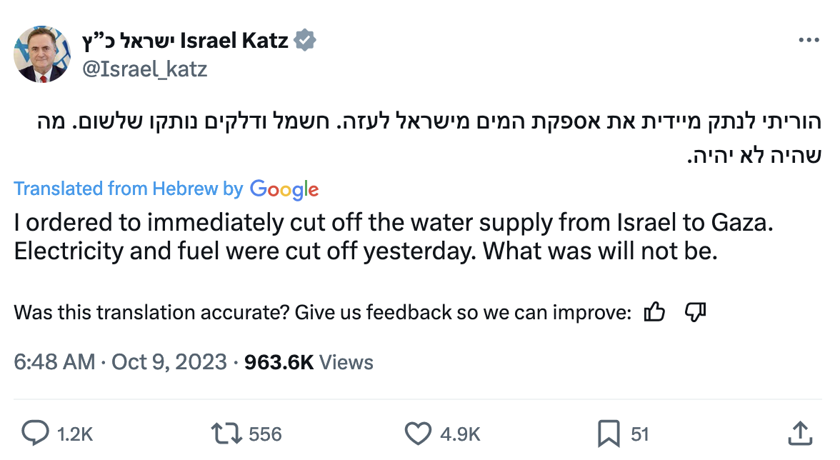 23. I ordered to immediately cut off the water supply from Israel to Gaza. Electricity and fuel were cut off yesterday. What was will not be.