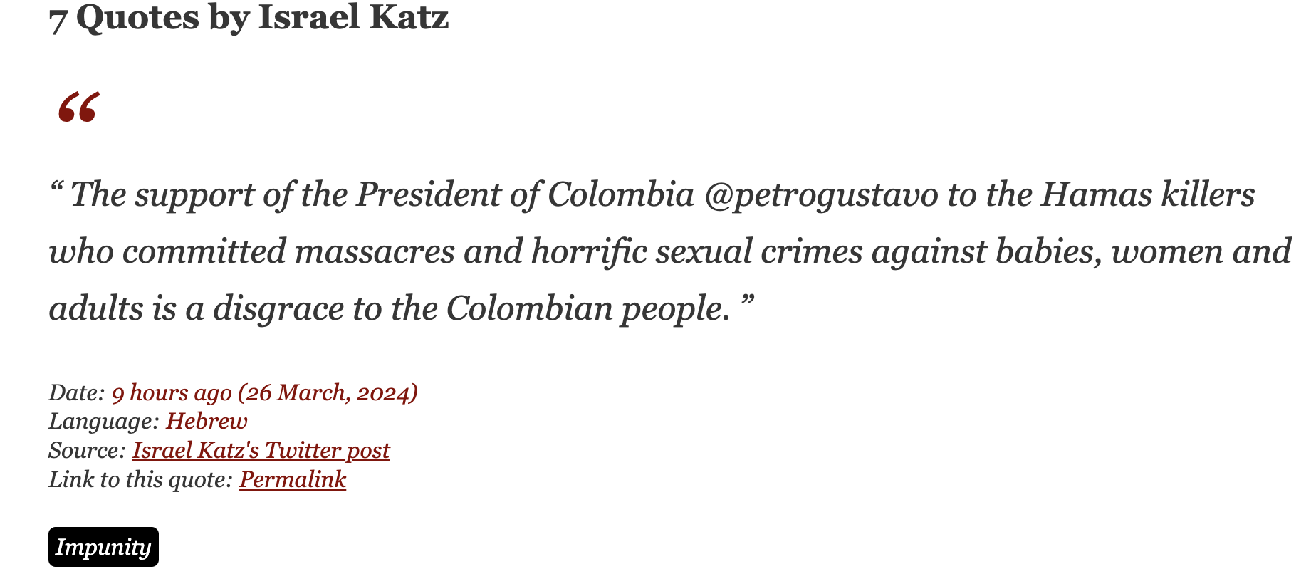 • Context: In response to the President of Colombia threatening to break diplomatic relations with Israel if Israel does not comply with the UN ceasefire resolution on Gaza.