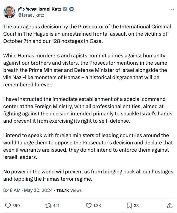 14. The outrageous decision by the Prosecutor of the International Criminal Court in The Hague is an unrestrained frontal assault on the victims of October 7th and our 128 hostages in Gaza. While Hamas murderers and rapists commit crimes against humanity against our brothers and sisters, the Prosecutor mentions in the same breath the Prime Minister and Defense Minister of Israel alongside the vile Nazi-like monsters of Hamas – a historical disgrace that will be remembered forever.