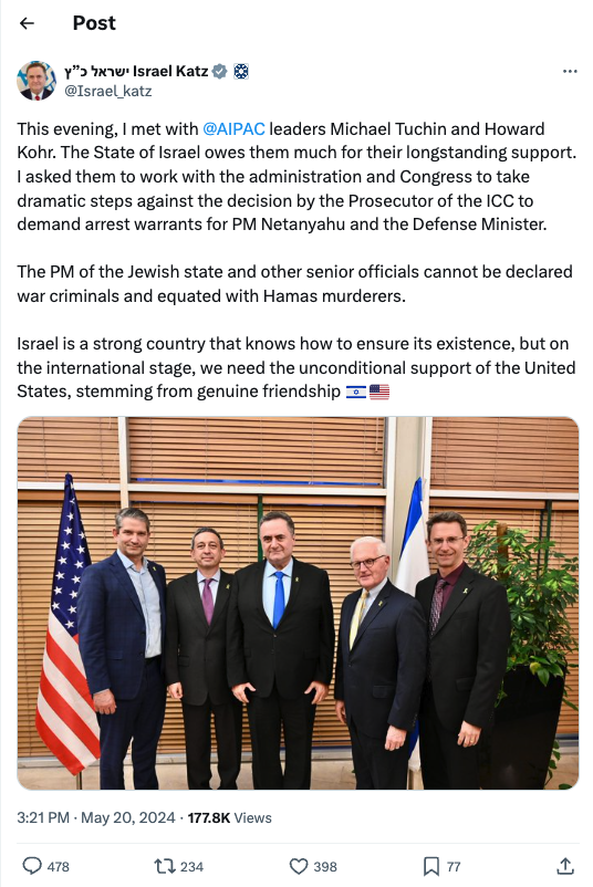 16. I met with @AIPAC leaders Michael Tuchin and Howard Kohr. The State of Israel owes them much for their longstanding support. I asked them to work with the administration and Congress to take dramatic steps against the decision by the Prosecutor of the ICC to demand arrest warrants for PM Netanyahu and the Defense Minister.