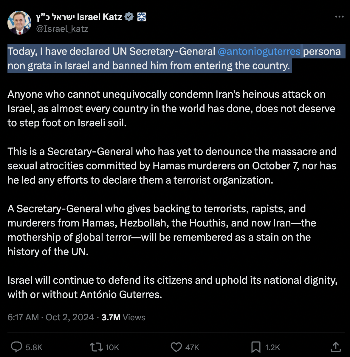 11. Today, I have declared UN Secretary-General @antonioguterres persona non grata in Israel and banned him from entering the country.