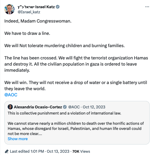 21. All the civilian population in gaza is ordered to leave immediately. We will win. They will not receive a drop of water or a single battery until they leave the world.