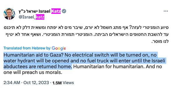 22. Humanitarian aid to Gaza? No electrical switch will be turned on, no water hydrant will be opened and no fuel truck will enter until the Israeli abductees are returned home.