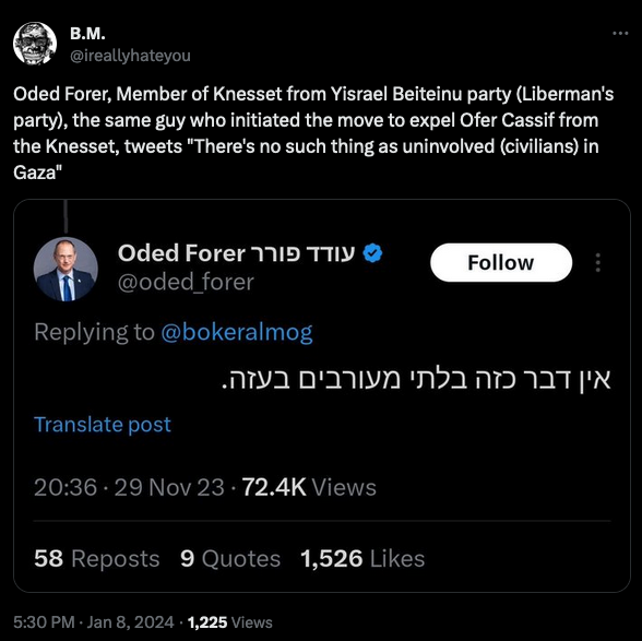 16. There is no such thing as innocent people in Gaza... The biggest enemy of the children in Gaza is people like them (MKs Ofer Cassif & Aida Touma Sliman)... who keep their mouths shut when... they (Palestinians) raise an entire population of Nazis.
