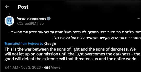 50. [T]his is the war between the sons of light and the sons of darkness. We will not let up on our mission until the light overcomes the darkness — the good will defeat the extreme evil that threatens us and the entire world.