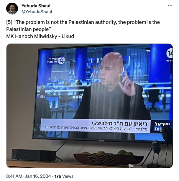 12. The day after the return of all the hostages home, we need to continue the war... We can't live with these creatures by our side... The Gaza Strip is full of terrorists. Any child who is born (there) now is already a terrorist, from the moment of his birth.
