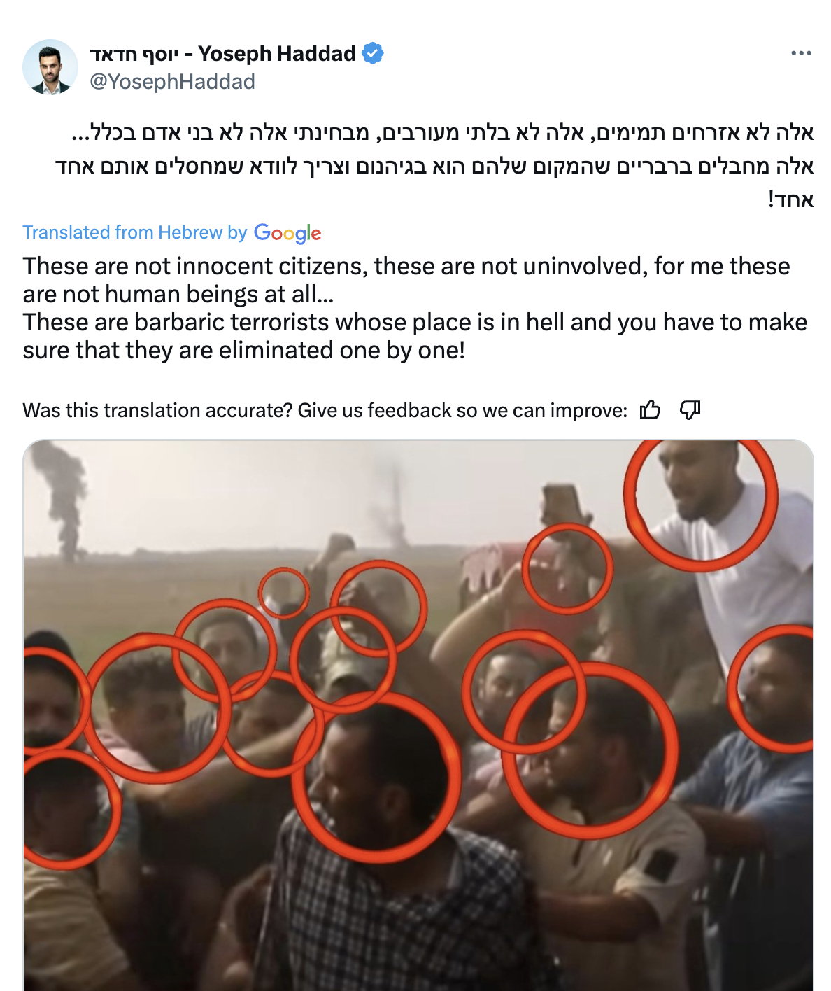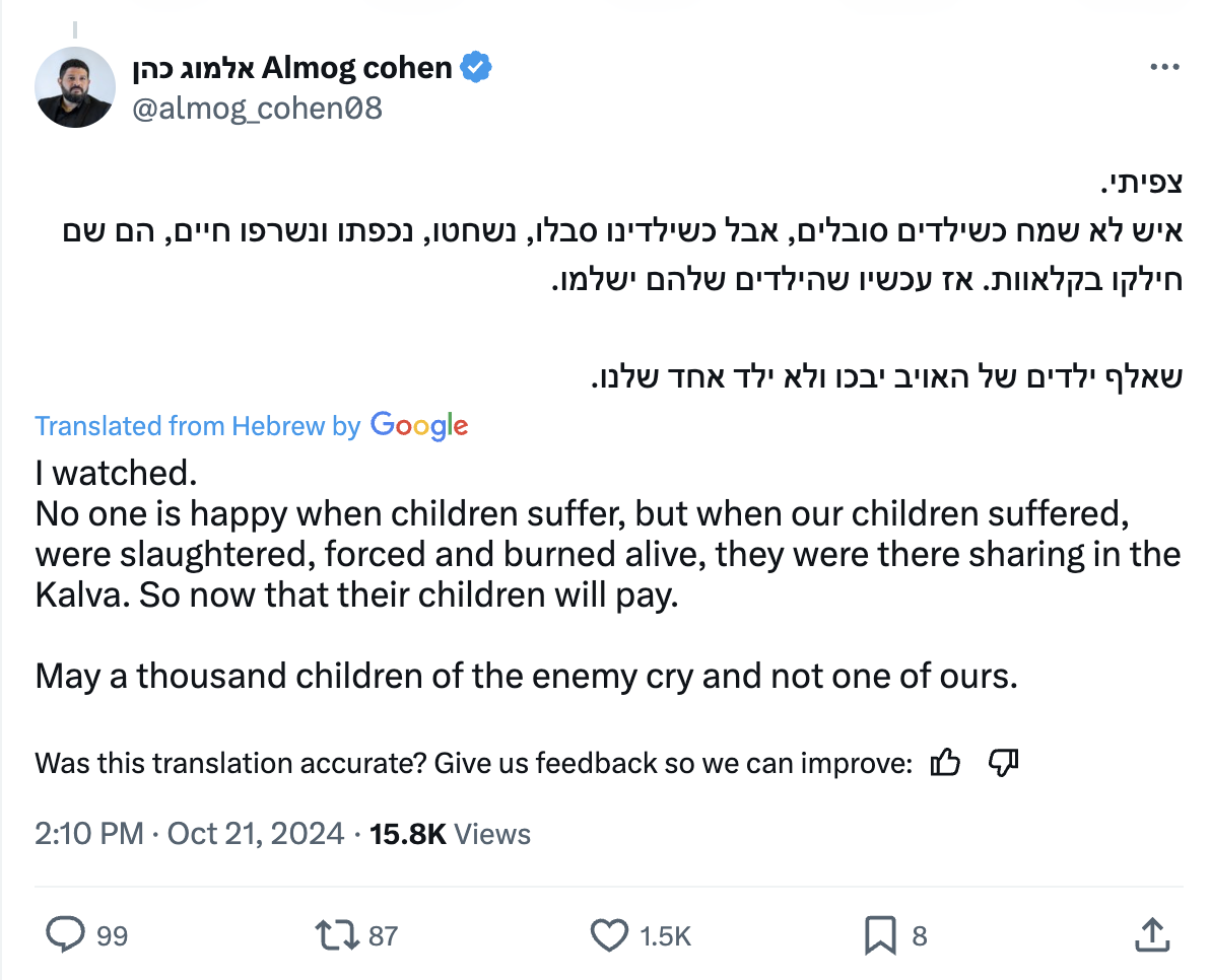 24. These people there [in Gaza] deserve death. A hard death, an agonizing death. And instead we see them enjoying on the beach, having fun... There are no innocent people there in the Gaza Strip... They are now enjoying on the beach, instead of starving, being jerked around, being severely tormented and hiding from shelling... We should have seen a lot more revenge, a lot more rivers of Gazans' blood
