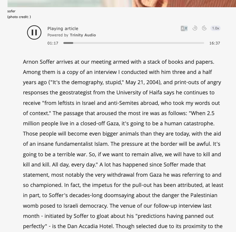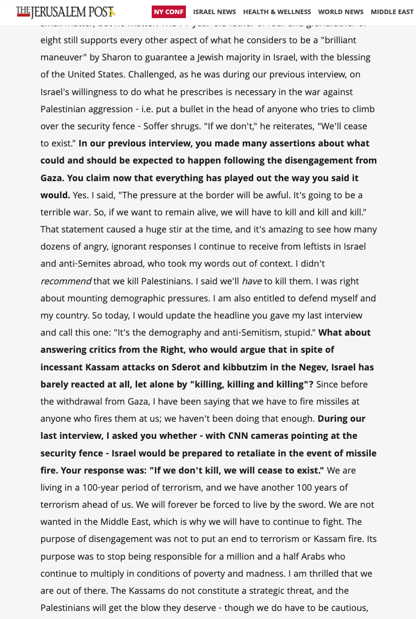 74. I didn't recommend that we kill Palestinians. I said we'll have to kill them. I was right about mounting demographic pressures.