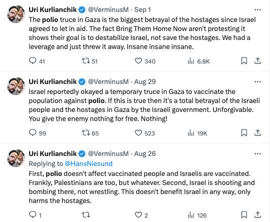 21. Israel reportedly okayed a temporary truce in Gaza to vaccinate the population against polio. If this is true then it's a total betrayal of the Israeli people and the hostages in Gaza by the Israeli government. Unforgivable. You give the enemy nothing for free. Nothing!