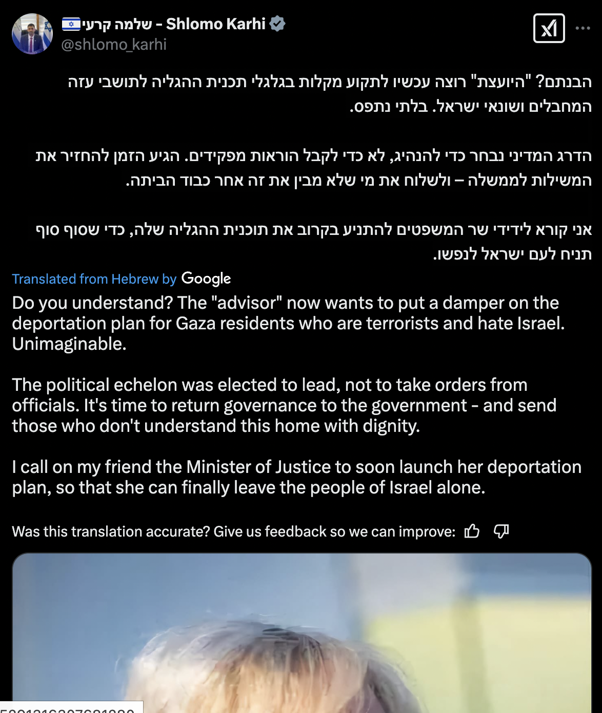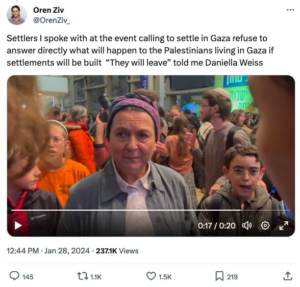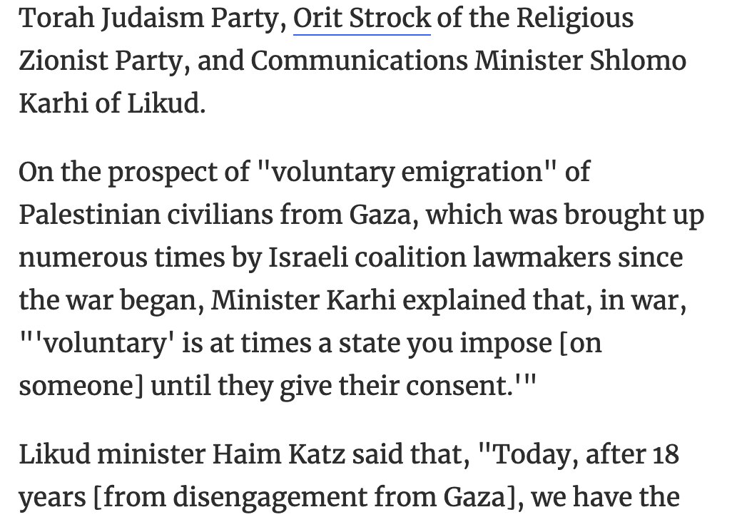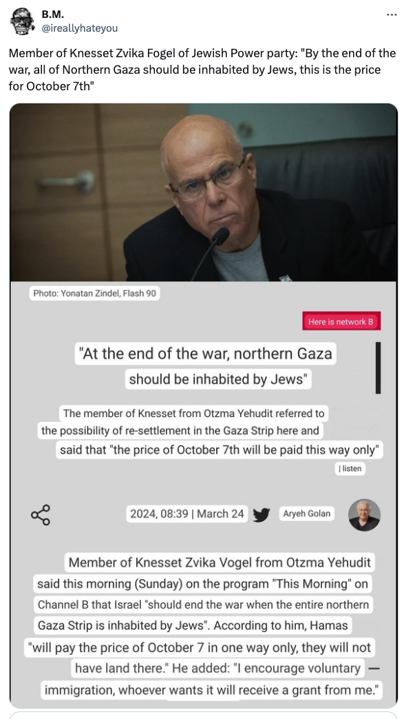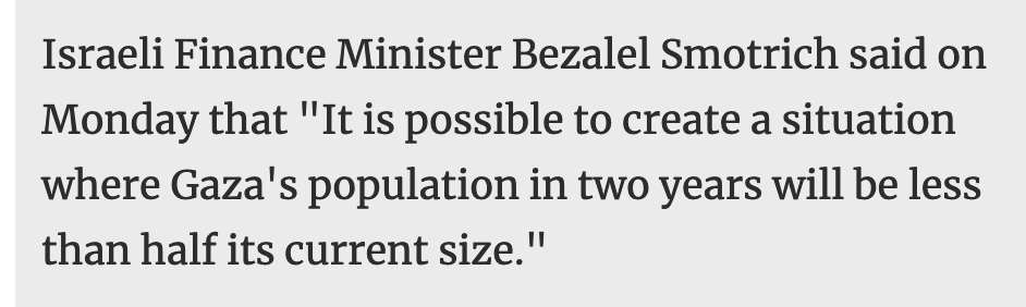 After we turn Khan Younis into a soccer field […] we need to take advantage of the destruction to tell the countries that each of them should take a quota, it can be 20K or 50K. We need all 2 million to leave. That's the solution for Gaza.
