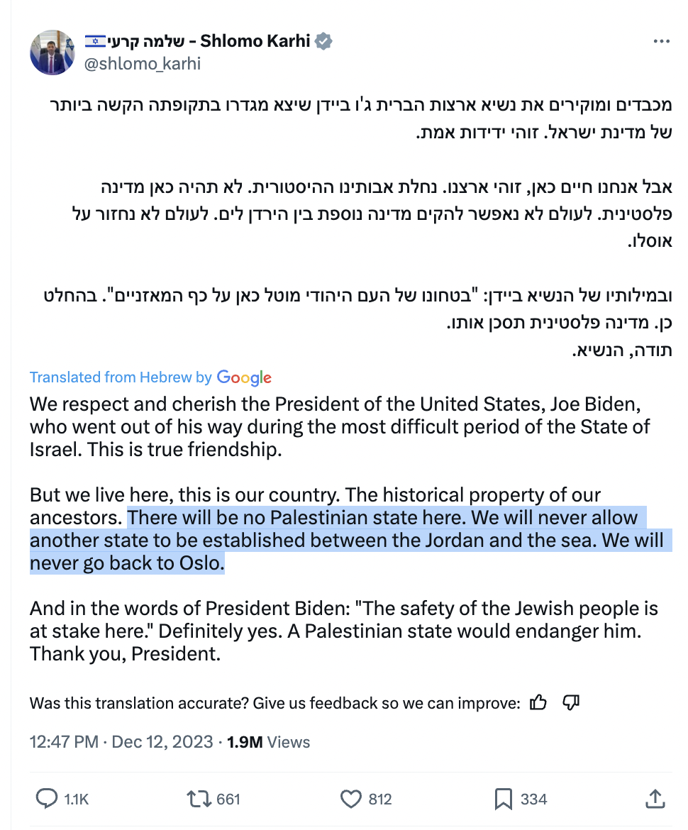 There will never be a Palestinian state here. We will never allow another state to be established between the Jordan River and the sea. We will never go back to Oslo.