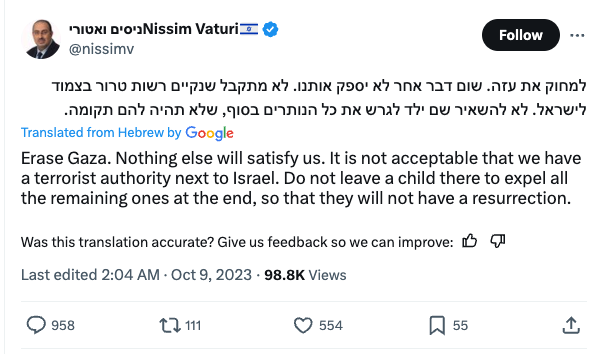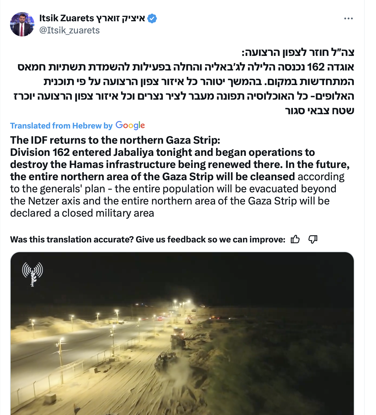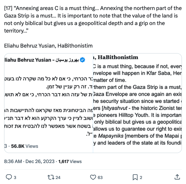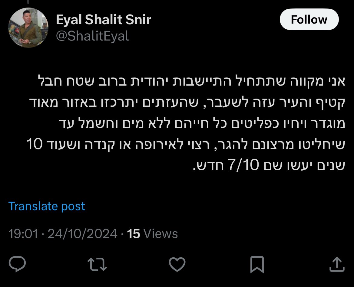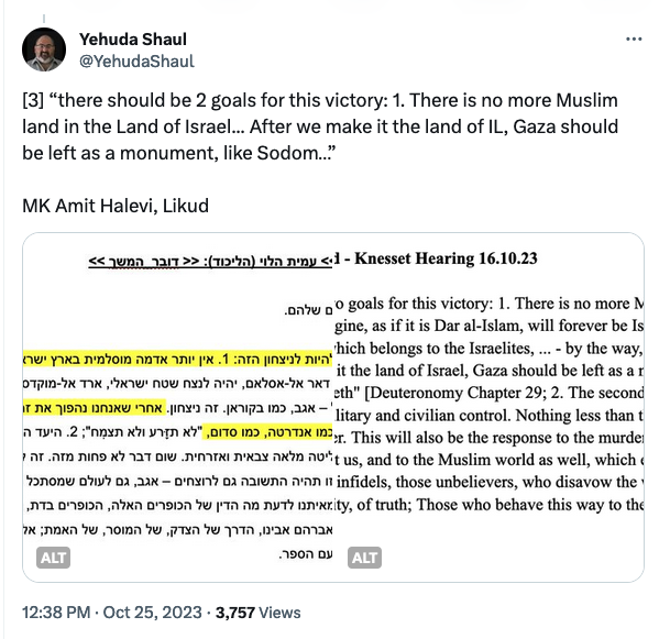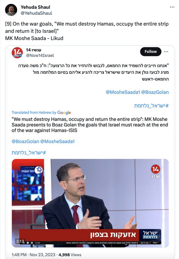 The north of the Gaza Strip, more beautiful than ever. Everything is blown up and flattened, simply a pleasure for the eyes ... We must talk about the day after. In my mind, we will hand over lots to all those who fought for Gaza over the years and to those evicted from Gush Katif” [a former Israeli settlement].