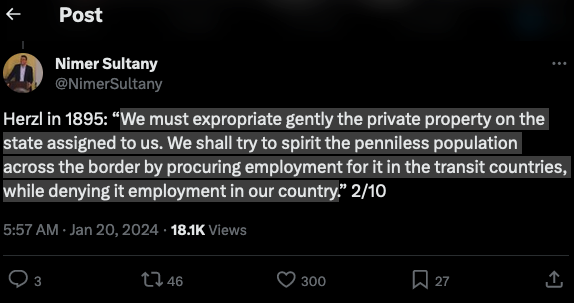 ...the transfer of [Palestinian] Arab population from the area of the Jewish state does not serve only one aim--to diminish the Arab population. It also serves a second, no less important, aim which is to advocate land presently held and cultivated by the [Palestinian] Arabs and thus to release it for Jewish inhabitants.