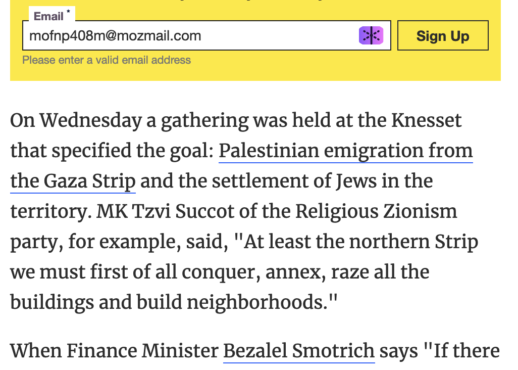 Occupation, settlement, and encouragement of emigration. Only in this way can we solve the problem of Gaza. To occupy all the land. To settle in all the land. And of course, to encourage the voluntary emigration of as many [Palestinian] people as possible to other countries.