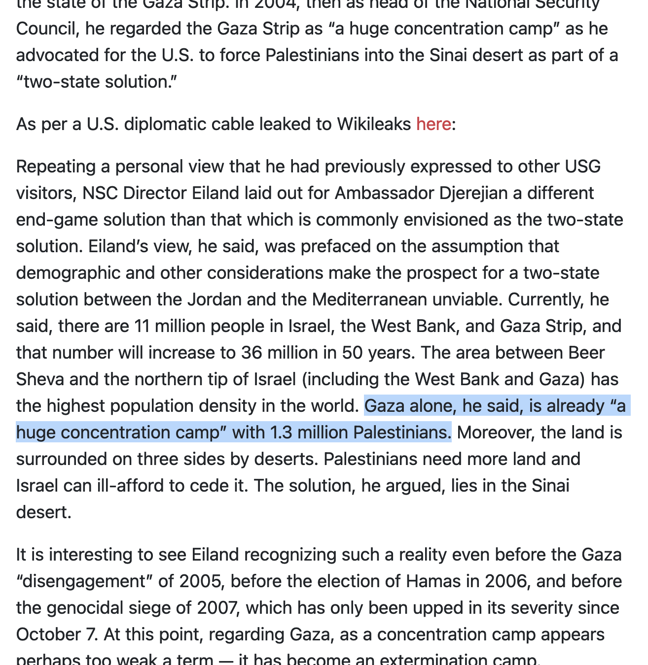 Gazans will be concentrated in a very defined area and live as refugees their whole lives without water or electricity until they decide, of their own accord, to emigrate.