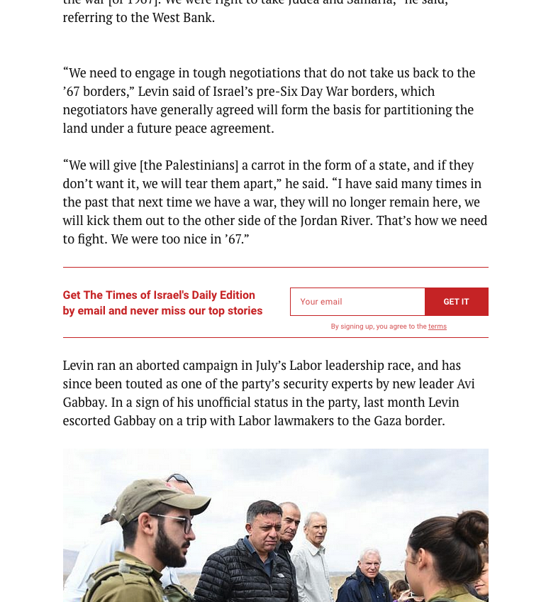 We will give [the Palestinians] a carrot in the form of a state, and if they don’t want it, we will tear them apart. I have said many times in the past that next time we have a war, they will no longer remain here, we will kick them out to the other side of the Jordan River. That’s how we need to fight. We were too nice in ’67.