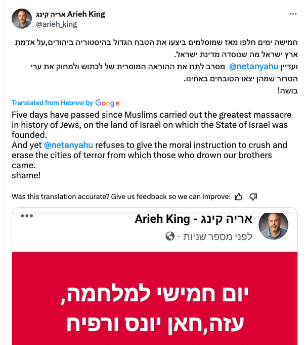 Five days have passed since Muslims carried out the largest massacre in history of Jews, on the land of Israel, since the establishment of the State of Israel. And still [N]etanyahu refuses to give the moral order to crush and erase the cities of terror from which the murderers of our brothers emerged. Shame!
