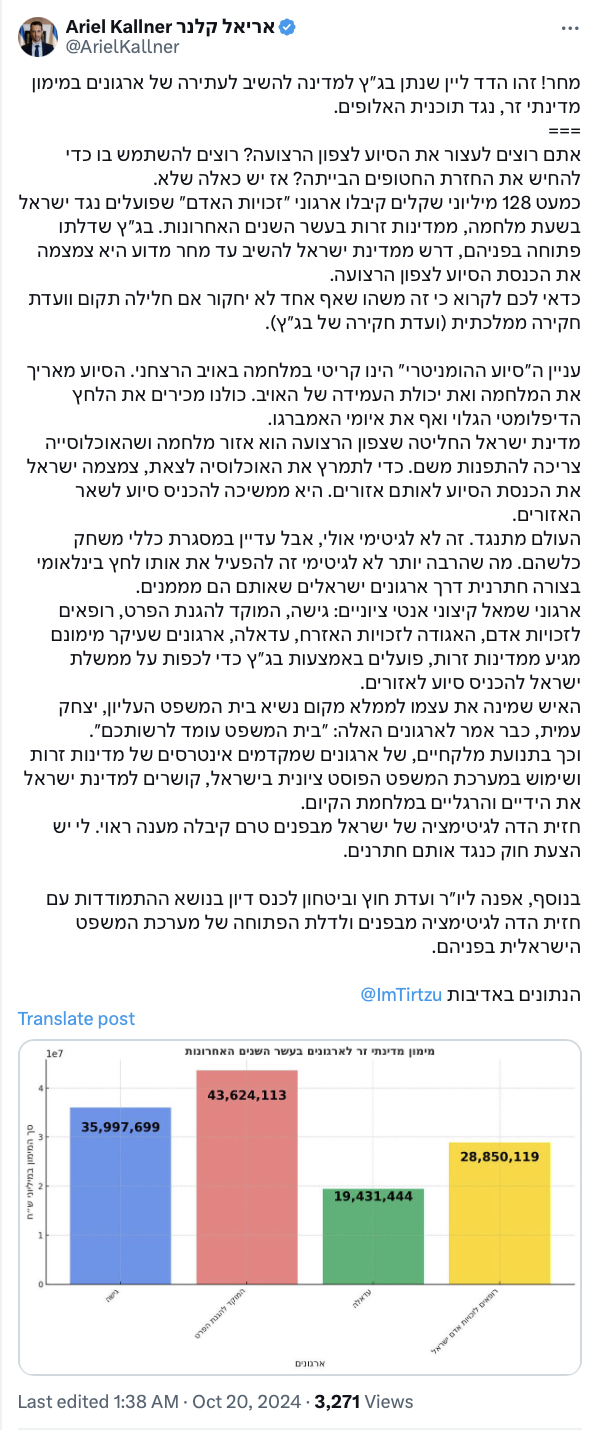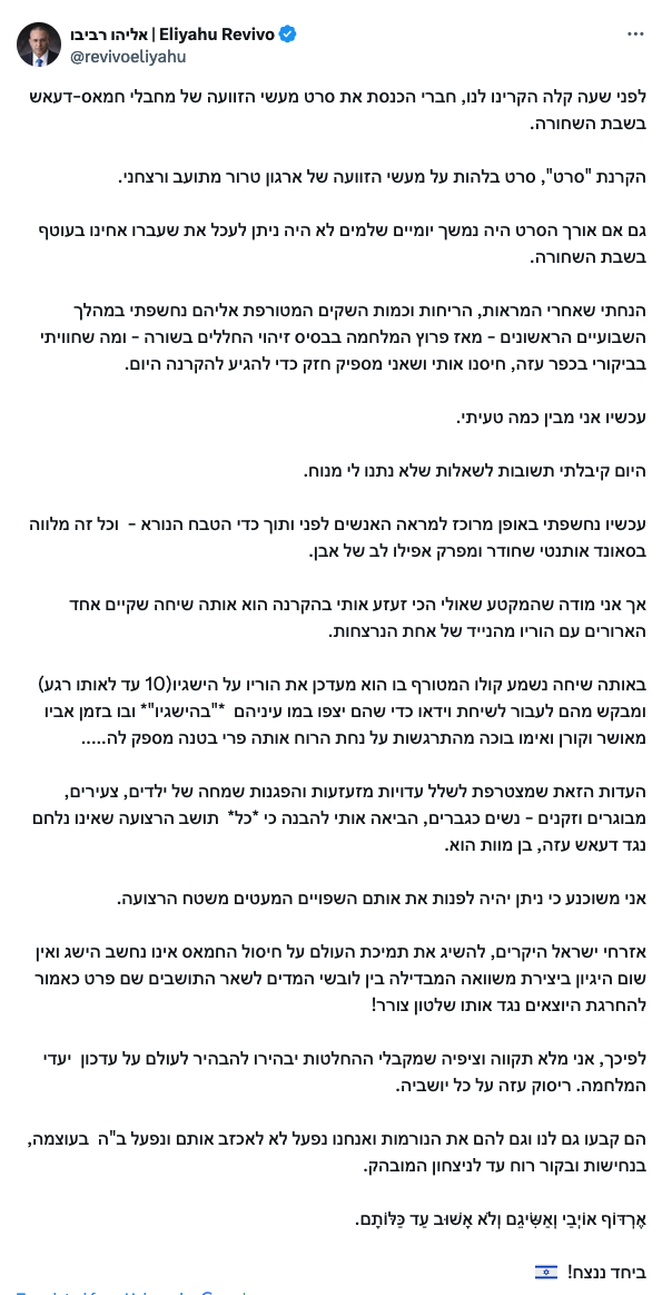 This [attack] is not enough, there should be more, there should be no limits to the response, I said it a million times, until we see hundreds of thousands fleeing Gaza, we, the IDF has not achieved its mission, this is a phase that should happen, I am saying this cause these are instructions that were said to the IDF [...] I also do not want [the IDF] to get inside [Gaza] before crushing everything, I’d rather the falling of fifty buildings than one more casualty to our forces.