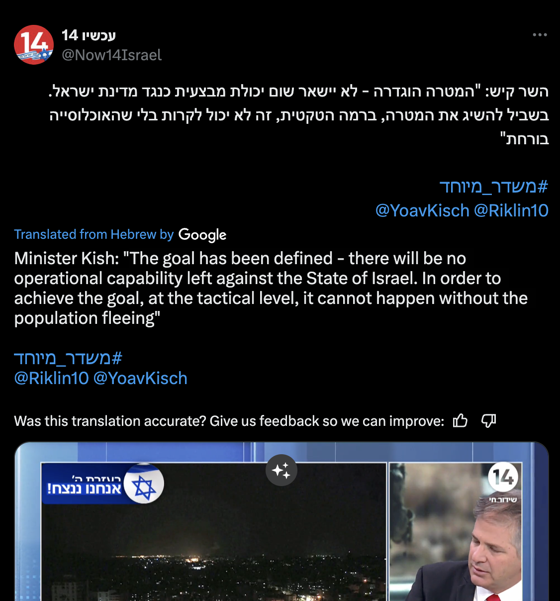 If we make sure that they will have many dead and that 400k refugees flee through the Rafah crossing, there will be no fear of mass slaughter among our soldiers [...] the IDF is acting now, which pushes the residents [...] into the cities. The immigration gates to Egypt and the sea should be opened. Allow people to go out and make it clear: whoever chooses to go out, has gone out.