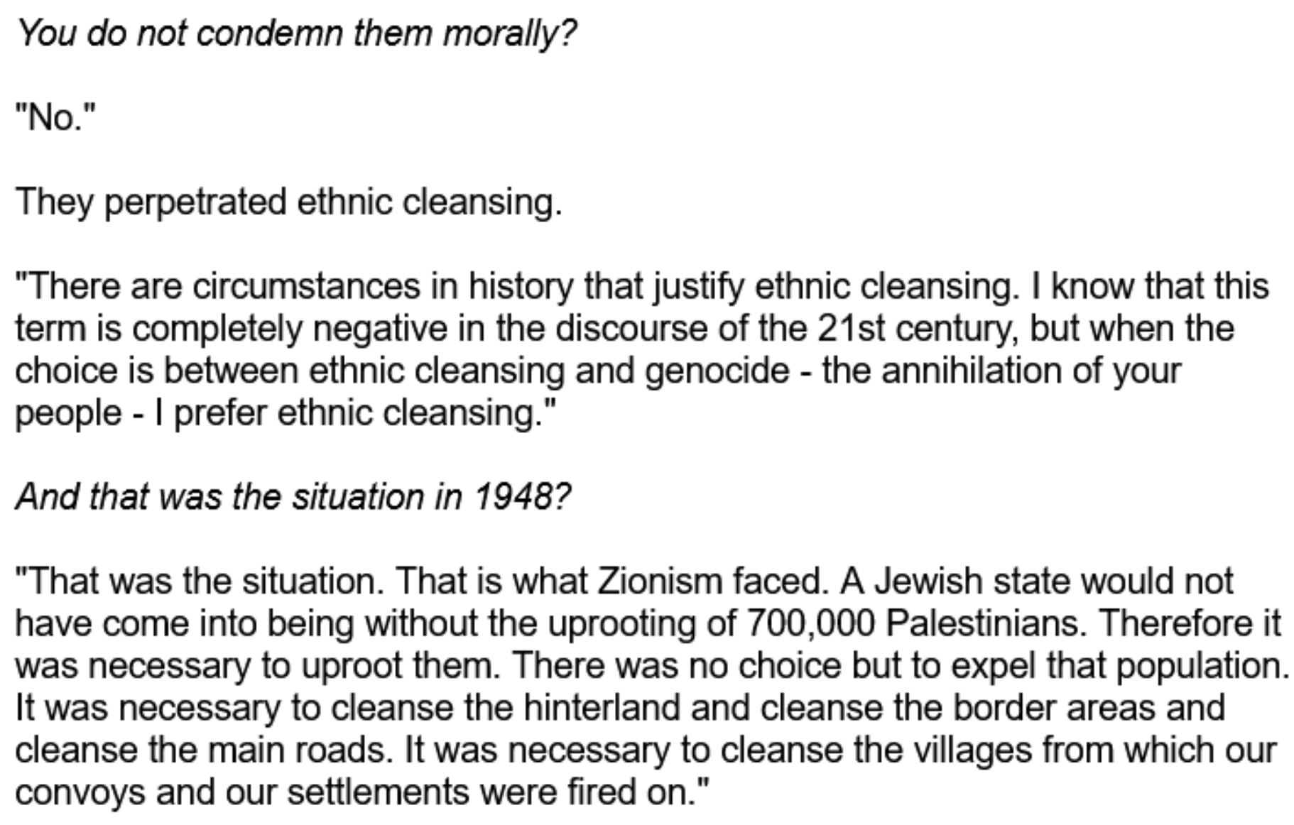 There are circumstances in history that justify ethnic cleansing ... A Jewish state would not have come into being without the uprooting of 700,000 Palestinians. Therefore it was necessary to uproot them ... It was necessary to cleanse the hinterland ...