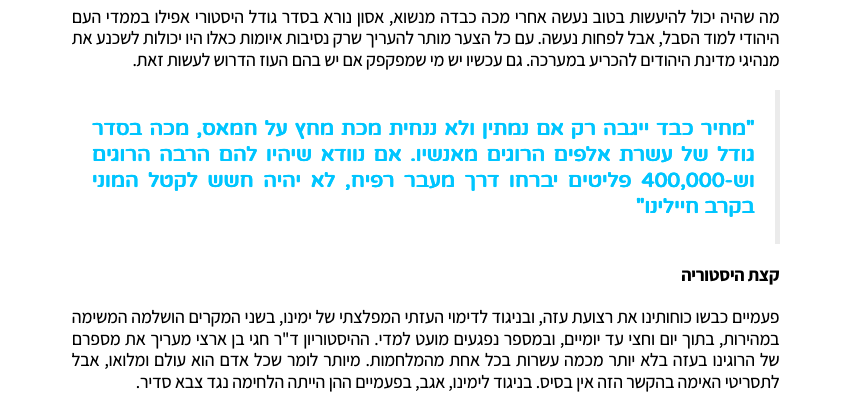 I think it will be possible to declare 'we have won' within a few months. Gaza will be completely destroyed, its civilians will be concentrated south of the Morag Axis - and from there, they will leave in large numbers to third countries.