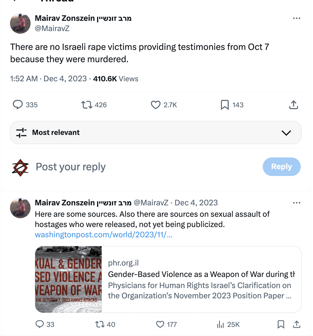 There are no Israeli rape victims providing testimonies from Oct 7 because they were murdered.