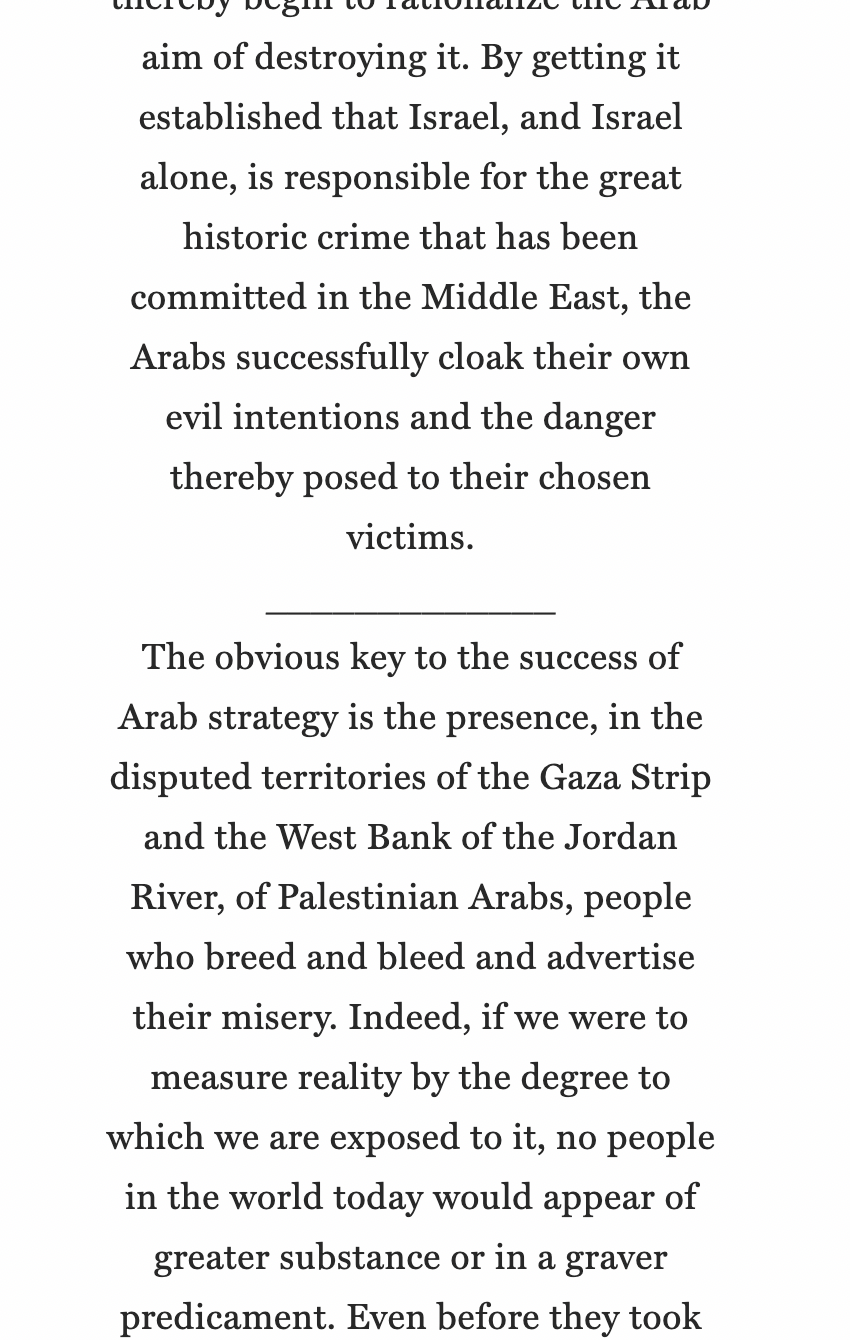 The obvious key to the success of Arab strategy is the presence, in the disputed territories of the Gaza Strip and the West Bank of the Jordan River, of Palestinian Arabs, people who breed and bleed and advertise their misery.