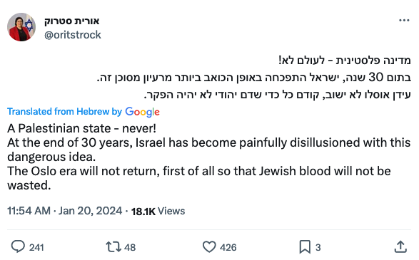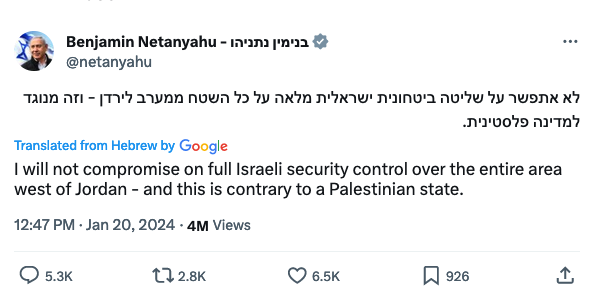 32. There will never be a Palestinian state here. We will never allow another state to be established between the Jordan River and the sea. We will never go back to Oslo.