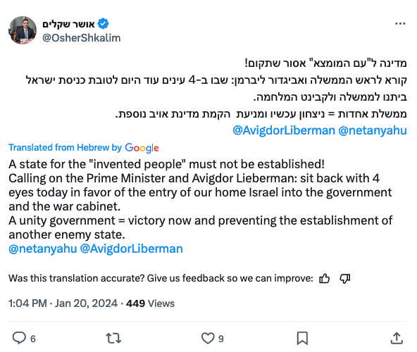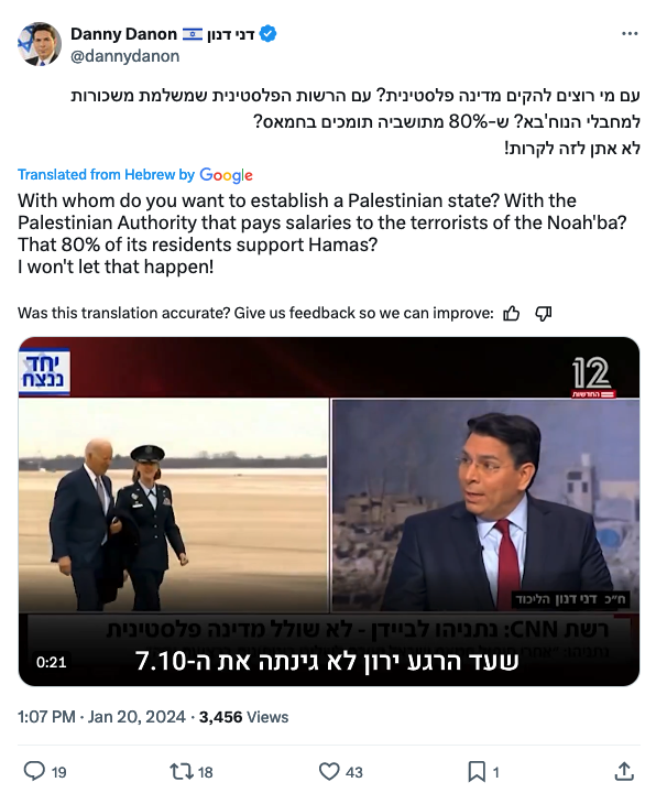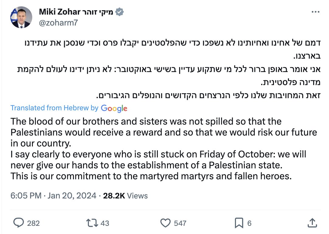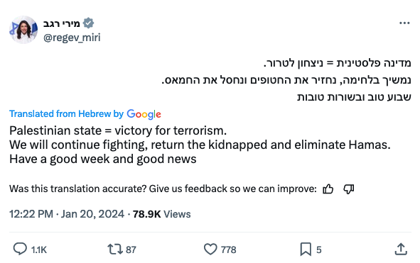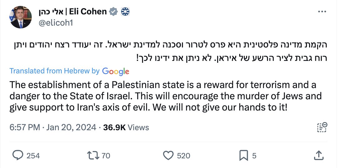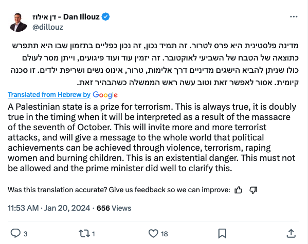 22. A Palestinian state is a prize for terrorism. This is always true, it is doubly true in the timing when it will be interpreted as a result of the massacre of the seventh of October. This will invite more and more terrorist attacks, and will give a message to the whole world that political achievements can be achieved through violence, terrorism, raping women and burning children. This is an existential danger. This must not be allowed and the prime minister did well to clarify this.