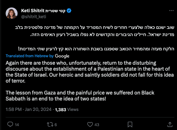 21. There are those who, unfortunately, return to the disturbing discourse about the establishment of a Pal state in the heart of the State of IL … The lesson from Gaza and the painful price we suffered on Black Sabbath is an end to the idea of 2 states!