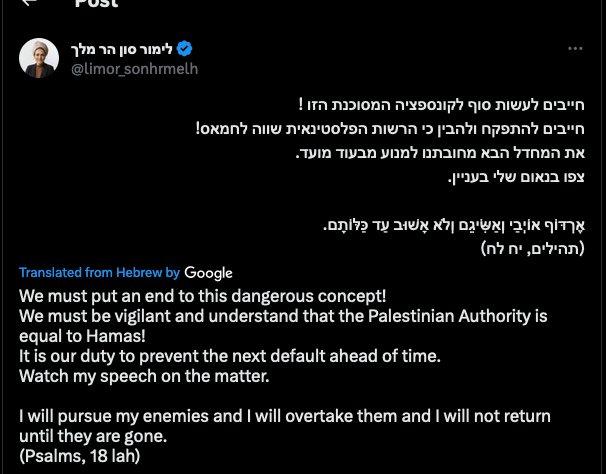 26. We must put an end to this dangerous concept! We must be vigilant and understand that the Palestinian Authority is equal to Hamas! It is our duty to prevent the next default ahead of time … I will pursue my enemies and I will overtake them and I will not return until they are gone.