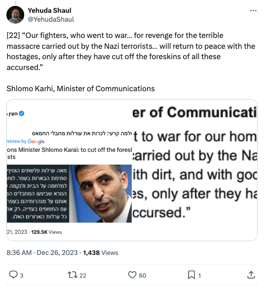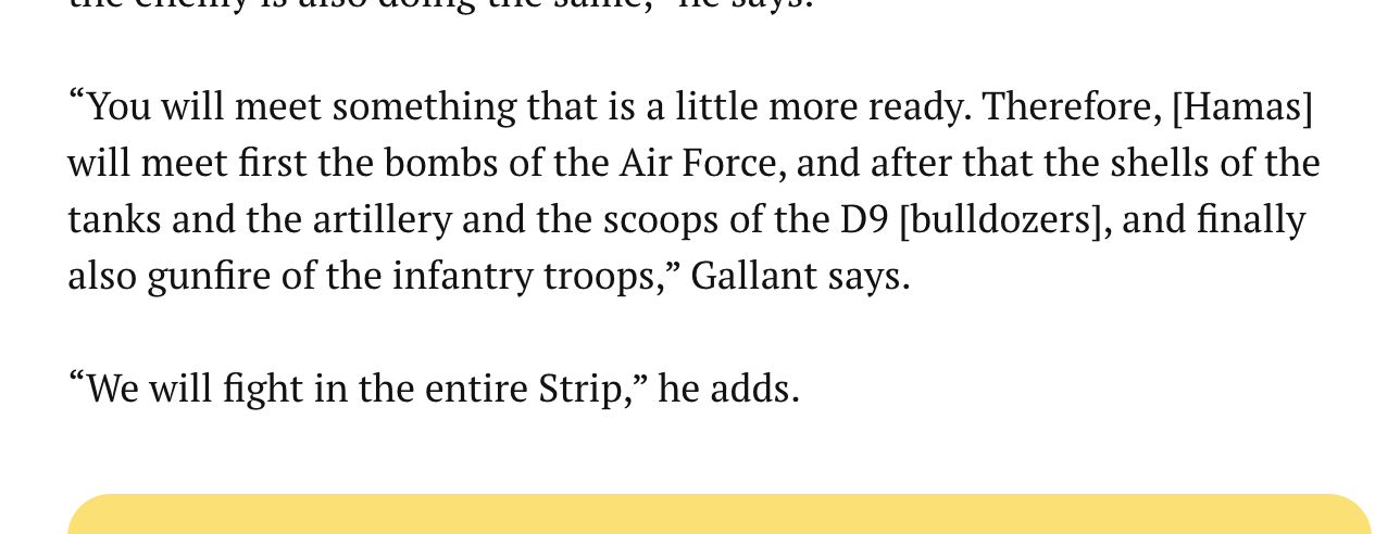 41. I would like to say that we, in Israel, at least the population, are not interested in all this rational Palestinian talk. For us, there is one purpose: to destroy Gaza, to destroy this absolute evil. To destroy this. There is no chance that after the holocaust, Jewish people will live similar experiences as they [experienced] 80 years ago.