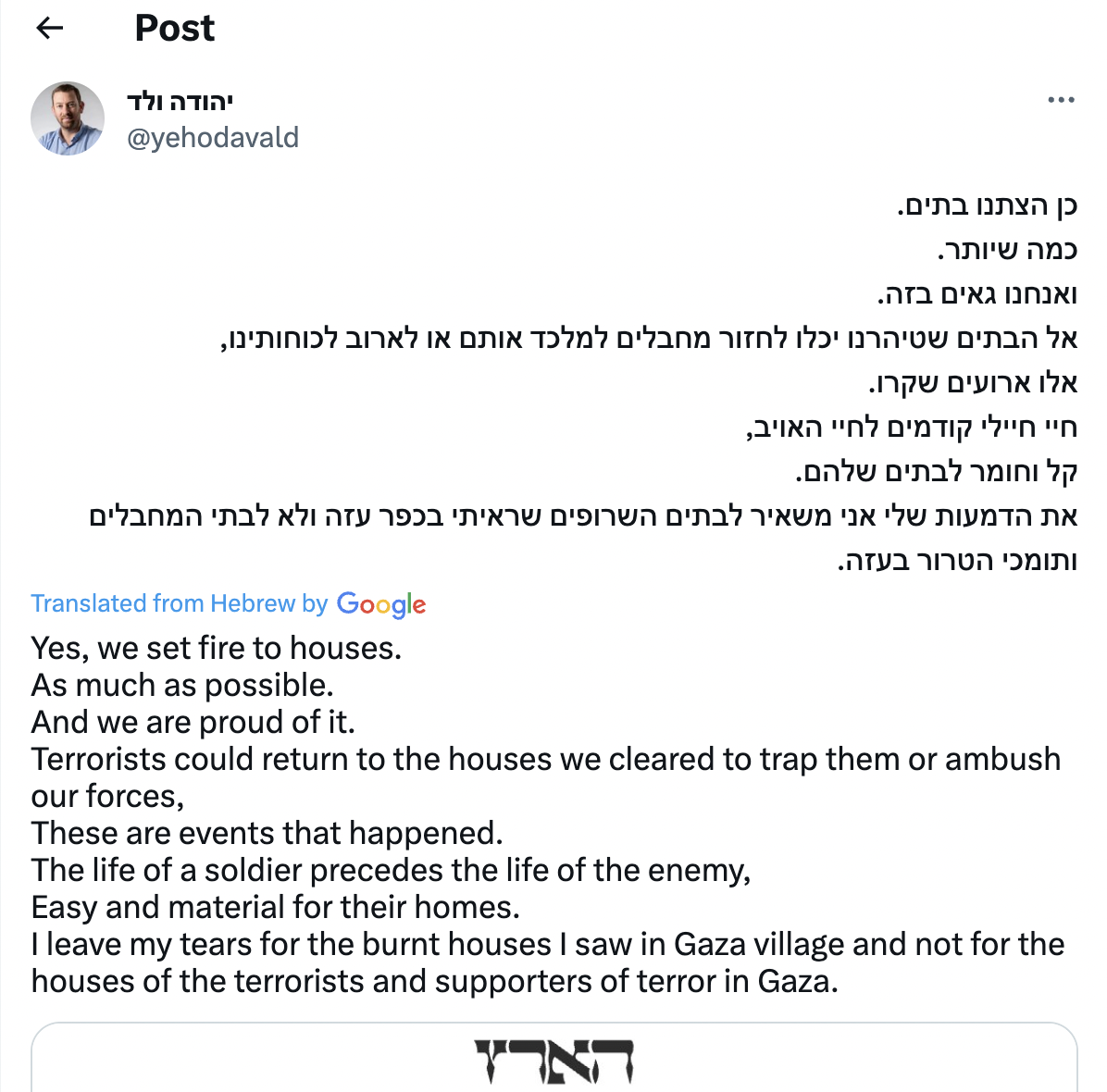 24. Yes, we set fire to houses [in Gaza]. As much as possible. And we are proud of it.