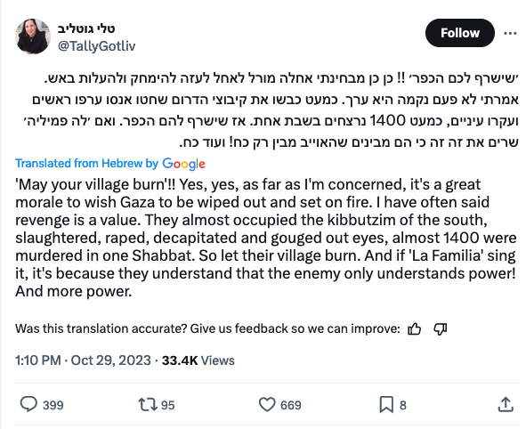 37. 'May your village burn'!! Yes, yes, as far as I'm concerned, it's great morale to wish for Gaza to be erased and set on fire. I have said more than once that revenge is a value. They almost conquered the kibbutzim in the south, slaughtered, raped, beheaded, and gouged out eyes, nearly 1400 murdered in a single Sabbath. So let their village burn. And if 'La Familia' sings this, it's because they understand that the enemy only understands force! And more force.