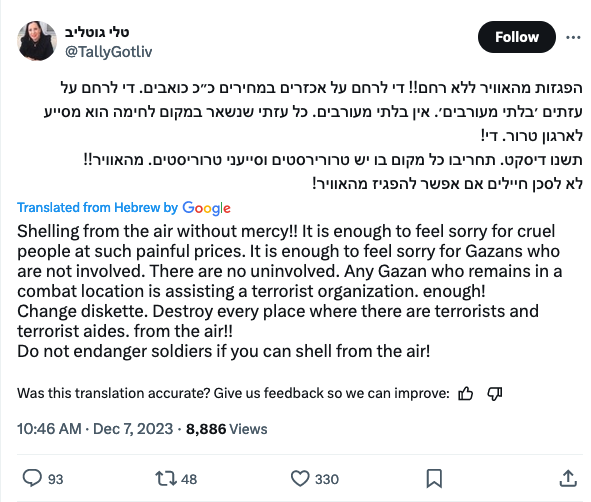 72. Hamas is not the enemy, but Gaza is the enemy. [...] It is not important who you warn, or who evacuates a neighborhood. This is what is called flattening the area, leveling the ground. You ask me what I would do? The answer is simply leveling the ground, and to kill the largest number possible. Because the woman is an enemy, the baby is an enemy, and the first grader is an enemy. The Hamas militant is an enemy and the pregnant woman is an enemy. We see it with our own eyes.