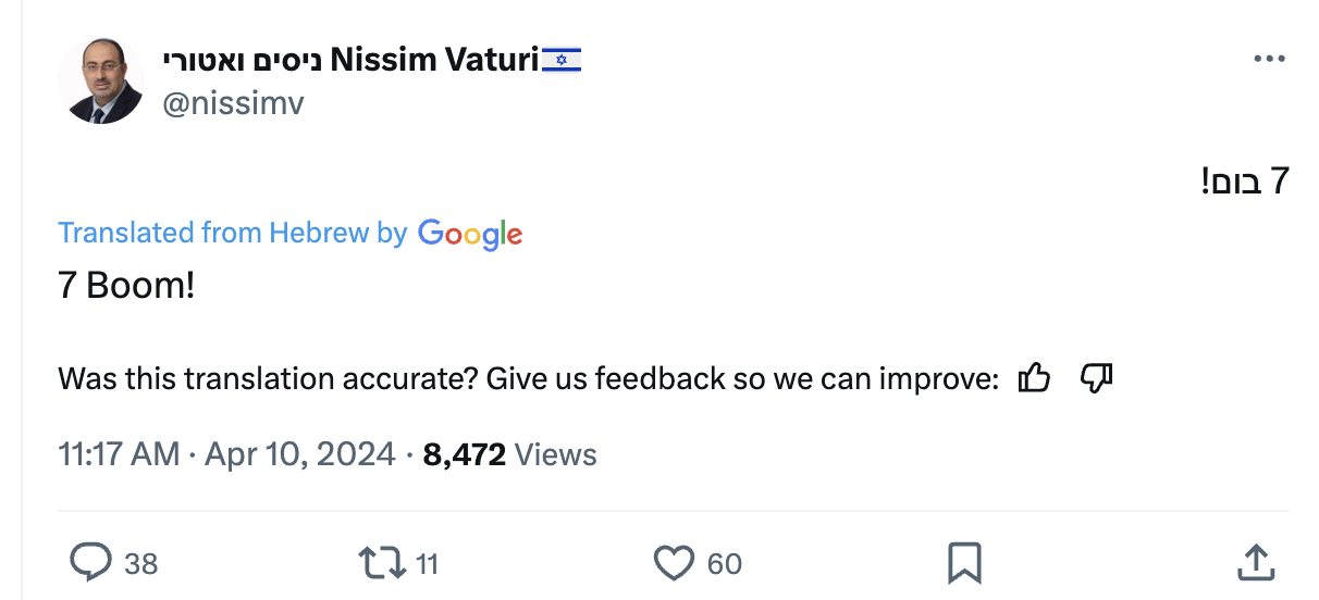 57. Throughout the past 24 hours, we have been conducting aerial strikes- destructive aerial operations that include thousands of armaments. To put that in perspective, the pace of the strikes is five times that of the strikes on Hezbollah in the Second Lebanon War. I repeat, five times what it was against Hezbollah in the Second Lebanon War.